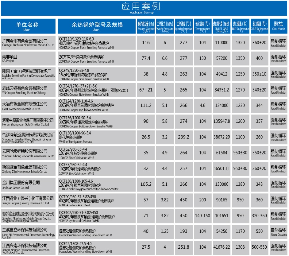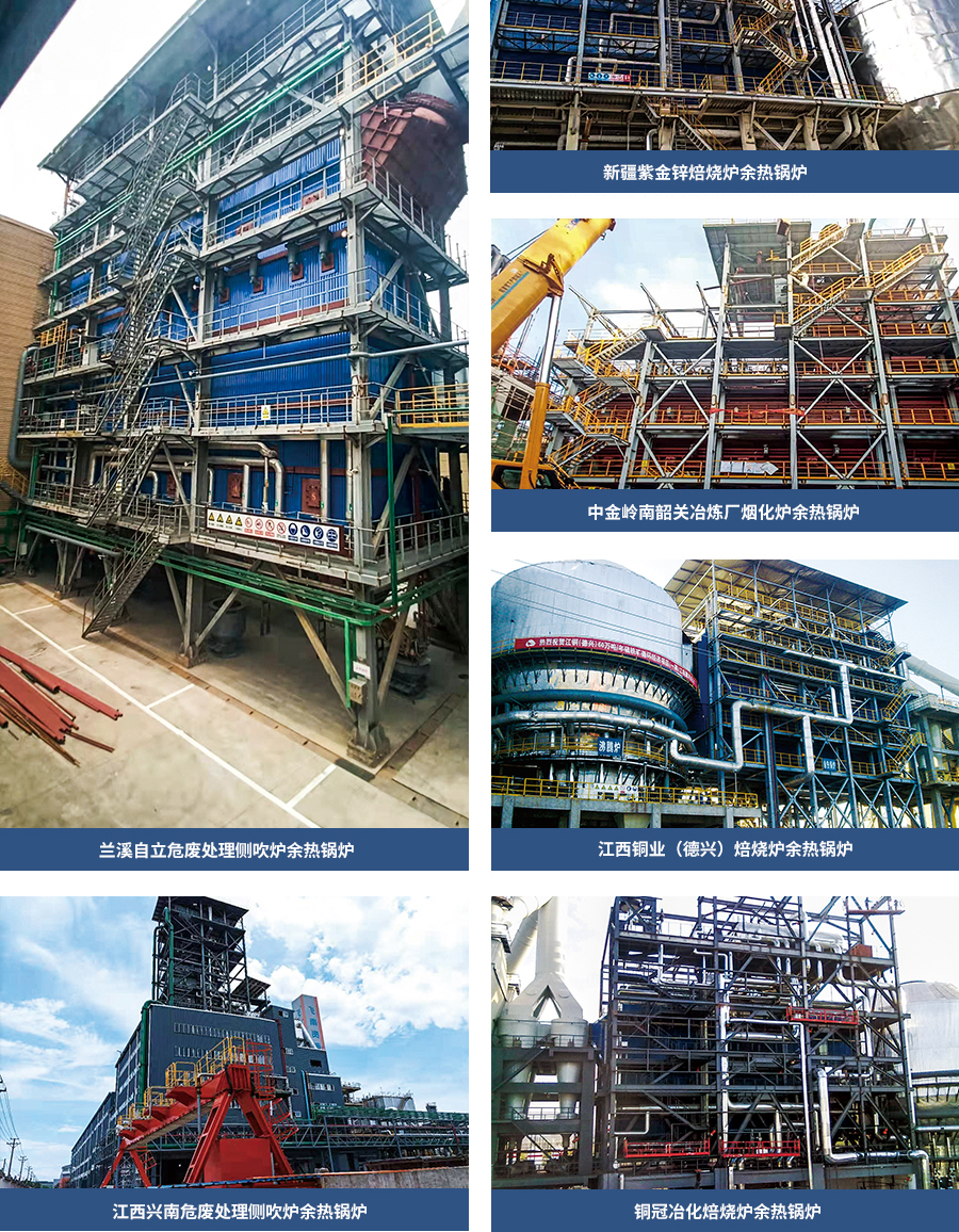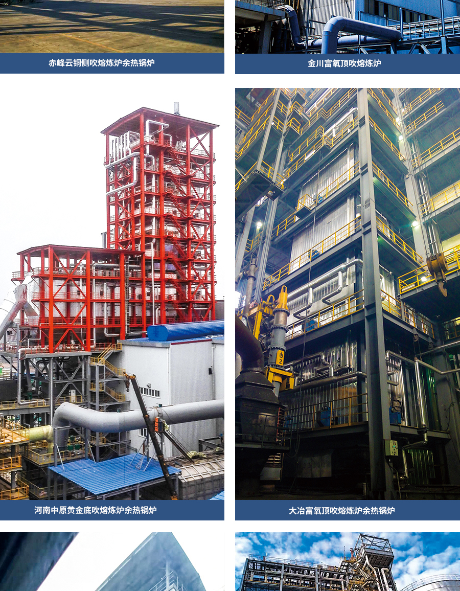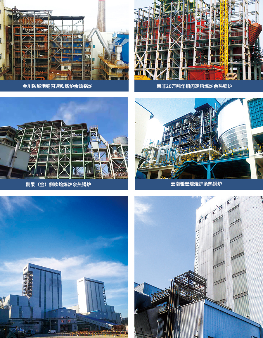 由我公司自主設計、制造、安裝的有色冶余熱鍋爐服務于國內外各大有色冶煉企業,如金川集團、紫金礦業、江西銅業、中國銅業、云南錫業、馳宏鋅鍺等,有色市場占有率90%以上。我們的研發團隊經過多年潛心研究,形成的產品有: