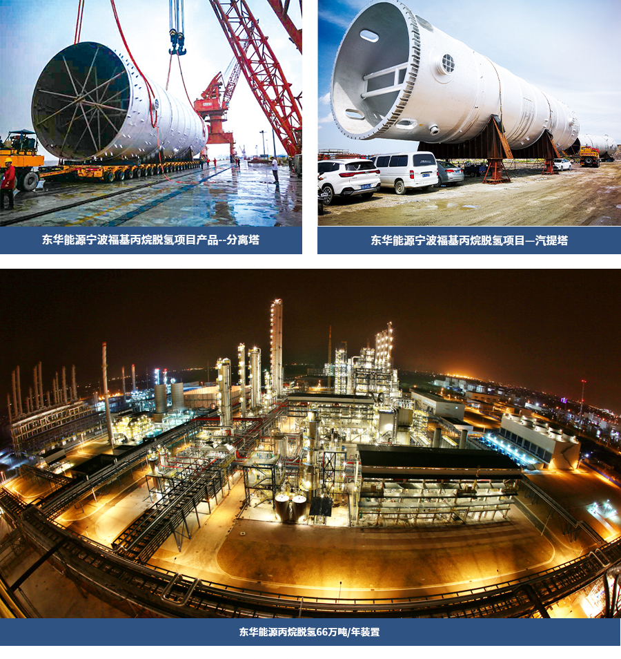 本公司為該項(xiàng)目提供了丙烷脫氫(PDH)裝置丙烯丙烷分離塔、脫丙烷塔、脫乙烷氣提塔等三臺大型設(shè)備,其中最大丙烯丙烷分離塔塔體直徑10米,長度108米,重量1400噸。